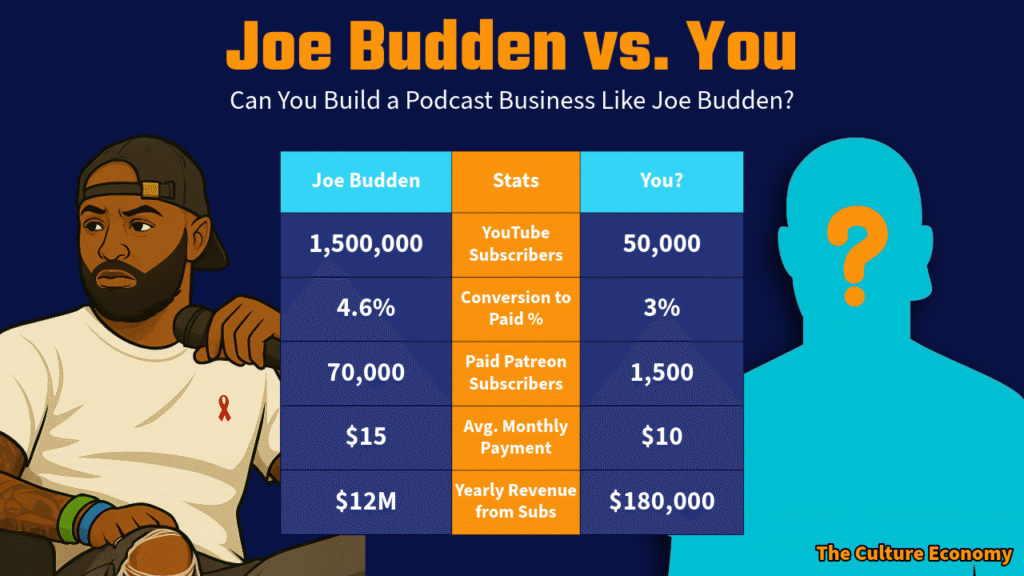 Budden’s success shows you can make massive money without a massive audience. He has fewer than 3.7M followers across the three main social platforms. He’s not a top-charting podcast on Apple or Spotify. He only ranks #9,156 on FamousBirthdays.com—he’s not even among the Top 20 “Joes”!